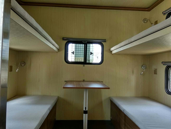 3、休息區(qū)備有4個(gè)上下鋪,配有床墊,每個(gè)上下床鋪依靠的墻壁上都有一個(gè)風(fēng)景透氣窗。每個(gè)床鋪下面設(shè)一組附件柜,床位兩側(cè)上方各配衣帽鉤、插座和可調(diào)節(jié)床頭燈,休息區(qū)配有19寸液晶電視一臺(tái)及空調(diào)一部。