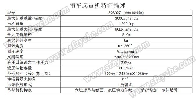 凈功率206kw; 起重機型號為:SQ302Z(帶液壓油箱),起重機質(zhì)量為:1200kg,最大額定超升載荷為:3000kg. 側(cè)防護金屬材料Q235斷面槽形,螺栓連接,斷面高度40mm,離地高度450mm; 后防護金屬材料Q235斷面槽形,螺栓連接,斷面高度135mm,離地高度500mm; 安裝具有衛(wèi)星定位功能行駛記錄儀,東風(fēng)越野隨車吊:m.5656115.com 吊機詳細參數(shù):