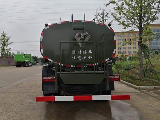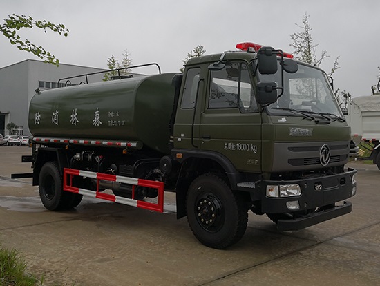 采用東風(fēng)EQ2180GD5DJ型越野汽車底盤,東風(fēng)一排半寬體駕駛室,4×4驅(qū)動,康明斯ISB190 50國五發(fā)動機,六檔變速箱,東風(fēng)商用車橋,前驅(qū)動橋3.8噸,后橋10噸,10.00R20輪胎,軸距4500mm,電動玻璃,方向助力,斷氣剎,ABS。罐體采用優(yōu)質(zhì)碳鋼QB235板材,板材厚度4mm,罐體容積11.1立方,變速箱安裝取力器,大功率水泵可泵進泵出,后置工作平臺帶水炮射程25米,消防栓接口左右各一個,選裝駕駛室頂部安裝長條警燈帶喊話器,全車顏色軍綠,兩側(cè)噴涂白色森林消防字樣。