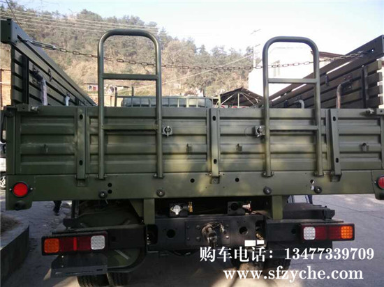 東風(fēng)國五天錦EQ1120GA2型運(yùn)兵車,4×2驅(qū)動,D530平頭一排半平頂駕駛室,,軸距3800mm,康明斯ISD245 50國五排放245馬力,6.7升發(fā)動機(jī),八擋變速箱,帶電加熱(預(yù)熱塞)冷起動裝置,全鋼全鋼 主油箱160L,80L副油箱,Φ395mm推式膜片彈簧離合器,東風(fēng) 4.5噸前橋,9噸后橋,主減速比5.286,車架斷面250×80×(7+4)mm,鋼板彈簧片數(shù)7/9+6,9.00R20鋼絲胎,電動玻璃升降器,中控門鎖,通道式儀表板,帶空調(diào),車廂內(nèi)部尺寸為4950x22325x600mm鐵木混合結(jié)構(gòu),邊板帶坐凳,板材采用國標(biāo)鋼材,邊板1.2mm,底板為3mm的花紋鋼板,車廂底橫梁用槽鋼加固,車廂縱副梁全槽鋼結(jié)構(gòu),能滿足客戶運(yùn)輸重型貨物,適應(yīng)部隊野外使用及冰雪路面行駛要求。全面繼承東風(fēng)40多年軍車越野車制造經(jīng)驗,動力總成匹配合理,生產(chǎn)技術(shù)成熟穩(wěn)定,整車車輛全面通過軍檢。