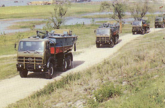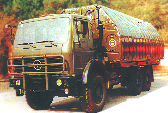 鐵馬XC2200重載卡車(chē)在1980年后期進(jìn)入PLA服役,主要用于運(yùn)輸重型工程設(shè)備和武器系統(tǒng)。中國(guó)鐵馬(Tiema) XC2200重載卡車(chē)由西南汽車(chē)廠(現(xiàn)在北方- 奔馳卡車(chē)公司分部)制造,位于重慶(Chongqing)市?ㄜ(chē)以德國(guó)梅賽德斯-奔馳2060型卡車(chē)為基礎(chǔ)。目前卡車(chē)在PLA服役中,被當(dāng)做重型工程設(shè)備卡車(chē)和武器系統(tǒng)車(chē)底盤(pán)。PLA在1970年后期訂購(gòu)了少量的德國(guó)梅賽德斯-奔馳2026型重載卡車(chē)(8噸的容量,6X6)補(bǔ)充它不足的重載卡車(chē)。這些卡車(chē)主要地用于重型火炮拖車(chē)任務(wù)。PLA對(duì)車(chē)輛的性能印象深刻,并且接洽梅賽德斯- 奔馳公司去得到許可在中國(guó)聯(lián)合生產(chǎn)卡車(chē)。鐵馬XC2200(最初即是TM-SC2030)的發(fā)展,梅賽德斯- 奔馳2060型的一個(gè)中國(guó)仿造型,從1980年早期開(kāi)始。 西南汽車(chē)廠,一個(gè)中國(guó)北方工業(yè)總公司(NORINCO)位于重慶(Chongqing)市的下屬公司,被選擇當(dāng)做主承包商。1982年看到了原型的介紹。稍后在1985年中國(guó)從西德引進(jìn)了ZF機(jī)械變速箱和KHD413風(fēng)冷柴油發(fā)動(dòng)機(jī)技術(shù),兩者在鐵馬XC2200卡車(chē)上被采用。XC2200批量生產(chǎn)在1986年開(kāi)始,每年從生產(chǎn)線上生產(chǎn)2,000輛。大多數(shù)的這些車(chē)輛被PLA接收用于重貨物/設(shè)備運(yùn)輸、火炮拖車(chē)和武器系統(tǒng)車(chē)底盤(pán)。車(chē)輛包括在西藏高地、戈壁沙漠和中國(guó)最惡劣的道路和天氣狀況區(qū)域展示了優(yōu)良性能和可靠性。除了被PLA部署,車(chē)輛也被輸出到巴基斯坦、泰國(guó)、印尼和斯里蘭卡。XC2200采用雙車(chē)門(mén)正向控制駕駛室,位于發(fā)動(dòng)機(jī)艙上面。駕駛室有四個(gè)座位和在頂板有一個(gè)天窗。后面的貨物車(chē)身的后擋板和側(cè)擋板可放下,可拆卸蓬架和帆布蓬。單預(yù)備輪被垂直地安裝在乘員室后面,靠近載貨車(chē)箱在駕駛室和后貨物車(chē)體之間。這一個(gè)空間能用來(lái)容納一個(gè)修理工具箱和其它的裝載/卸貨設(shè)備。與第一代中國(guó)自行生產(chǎn)的重型臺(tái)車(chē)相比較,XC2200有好很多的通用性能,連同85公里/小時(shí)的最大道路速度和一個(gè)8噸的越野裝載能力。ZF5S-110/111 GPA變速箱有九個(gè)前進(jìn)檔和一個(gè)倒車(chē)檔。三個(gè)車(chē)軸和六個(gè)車(chē)輪全部運(yùn)行使用速度差速器鎖定裝置,即使當(dāng)車(chē)輛的一側(cè)上一個(gè)或更多的車(chē)輪沒(méi)有與地面接觸中,或已經(jīng)失去牽引,確保車(chē)輛持續(xù)驅(qū)動(dòng)。除了基本的貨物卡車(chē)改型之外,XC2200也可得到許多其它的改型, 包括4X4、8X8、長(zhǎng)軸距貨車(chē)、起重機(jī)、掩護(hù)所、架橋車(chē)、運(yùn)船車(chē)、道路鋪設(shè)車(chē)和多種武器系統(tǒng)車(chē)底盤(pán)。中國(guó)也已經(jīng)發(fā)展基于XC2200設(shè)計(jì)的WZ551輪式裝甲人員輸送車(chē)(APC)。鐵馬XC2200浮橋架橋卡車(chē)。鐵馬XC2200用于WS-1多管火箭發(fā)射裝置車(chē)底盤(pán)。鐵馬XC2200用于運(yùn)船車(chē)。