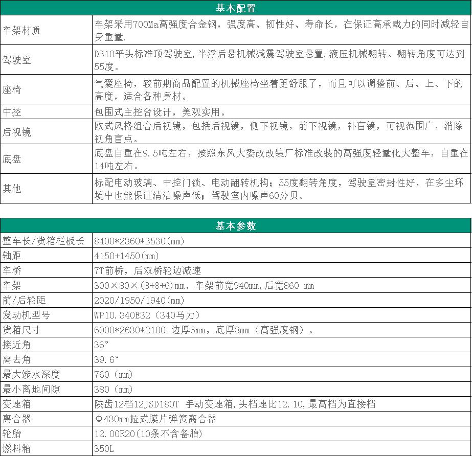 相關(guān)車型東風(fēng)大力神KC六驅(qū)自卸車配置參數(shù):DFL3251KC型六驅(qū)大力神自卸車,采用天龍大力神KC駕駛室,三段式保險杠,液壓翻轉(zhuǎn),帶原廠空調(diào),濰柴國三WP12.340型340馬力發(fā)動機(jī),法士特十二檔變速箱,軸距4500+1400mm,株齒分動箱,北奔9噸前驅(qū)動橋,選裝13/16噸輪減中后橋,輪減、差速鎖,大梁300mm自卸專用梁,輪胎12.00R20鋼絲胎10+1條,5.6米-6米自卸貨箱,車廂采用邊10底12mm鋼板,加裝淋水器。