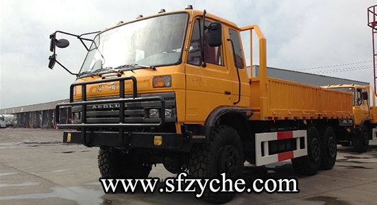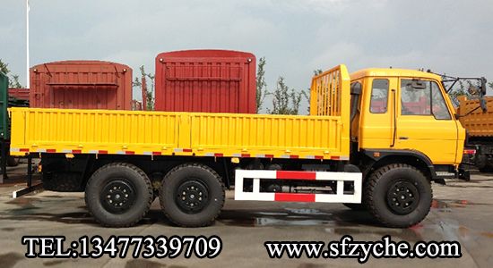 2、詳細配置:平頭一排半駕駛室,6*6驅(qū)動,康明斯190馬力,韶齒6檔變速箱,斷氣彈簧制動,貫通式中后驅(qū)動橋,12.5R20越野胎,軸距 3500+1250mm,加厚雙層大梁,貨箱4850mm,帶軍用保險杠。(新款仿天錦駕駛室加價1.5萬元)東風(fēng)越野卡車:m.5656115.com